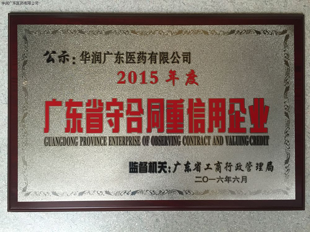近日,2015年度“廣東省守合同重信用企業(yè)”評(píng)選結(jié)果出爐,華潤(rùn)廣東醫(yī)藥有限公司被廣東省工商行政管理局授予“2015年度廣東省守合同重信用企業(yè)”的稱號(hào)。