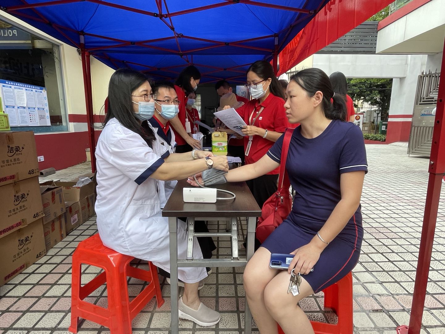 在總經(jīng)理劉先鋒及黨支部書記文小燕的帶領下,當天上午9點,中山公司一行20人來到了中山市石岐區(qū)民生社區(qū)居委會?;顒蝇F(xiàn)場,參與活動同事分為現(xiàn)場咨詢組、后勤補給組、文體組和送清涼組,按要求有序開展工作。現(xiàn)場工作人員熱情地為街坊進行常規(guī)的血壓測量和用藥咨詢服務,針對慢性病知識、防疫知識進行普及宣講,并對患者日常飲食進行了指導。另外,為進一步提升公司基層醫(yī)療藥事服務水平,本次活動安排了基層用藥問卷調(diào)查,共計回收有效問卷150份。